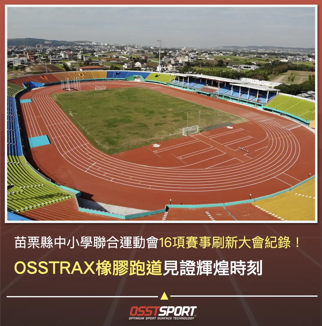苗栗縣中小學聯合運動會16項賽事刷新大會紀錄! 2025年2月5日至8日,114年苗栗縣中小學聯合運動會在苗栗縣立體育場盛大舉行,來自全縣各校的優秀選手在這片競技場上揮灑汗水,挑戰自我。 而今年賽事更是寫下驚人紀錄16項目、24人次成功刷新大會紀錄! 這不僅是選手們辛勤訓練的成果,也再次證明了優質運動場地對成績突破的關鍵影響! OSSTRAX合成橡膠跑道——助力選手突破極限! 作為本次賽事的比賽場地,苗栗縣立體育場鋪設的正是由弘佳工業 OSSTSPORT 所打造的 OSSTRAX 合成橡膠跑道。這款跑道以其優越的彈性、穩定的抓地力與卓越的耐用性,提供選手最理想的競技環境,幫助他們在賽場上發揮最佳狀態。